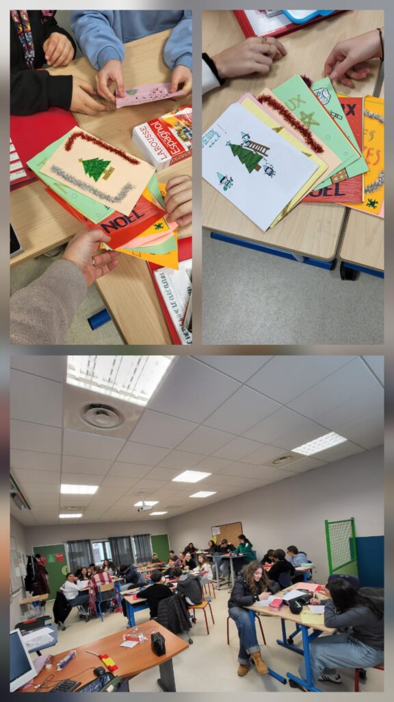 A l’occasion des fêtes de noël, les élèves de 5° et 4° ont reçus des cartes de vœux des élèves de l’IES Monte Neme de Carballo en Galice. Les cartes, rédigées en français, sont le 1er contact entre les élèves de nos deux établissements. Après la lecture des lettres, nos élèves travaillent à leurs réponses, en espagnol, afin de présenter leurs vœux de bonne année à leurs correspondants espagnols. L’occasion aussi de se présenter à eux.