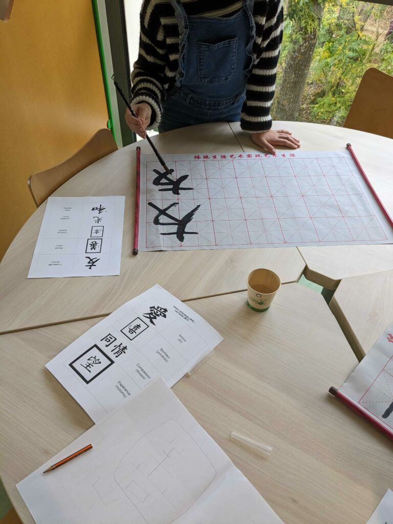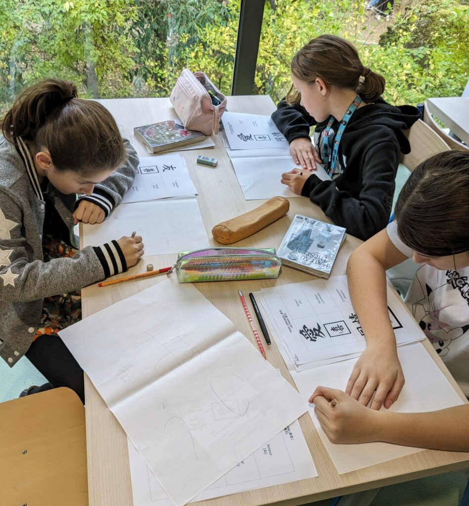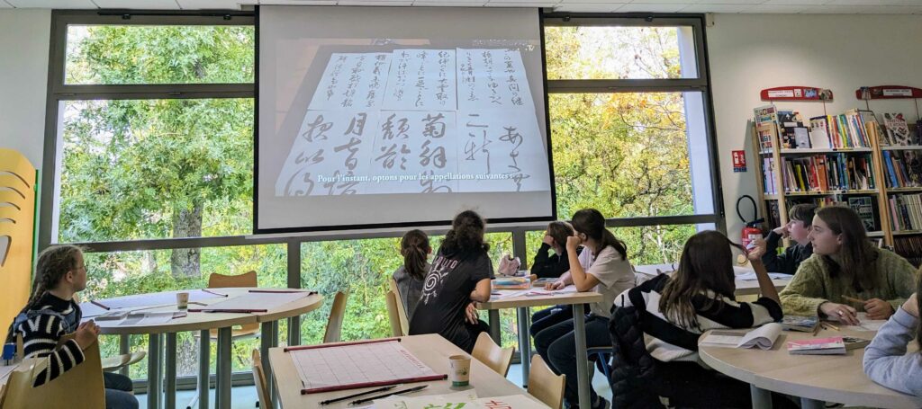 Après avoir visionné une vidéo en japonais sur l’art de la calligraphie au Japon, les élèves ont pu s’entraîner au tracé des « kanji » (idéogrammes) en vue d’une exposition prochaine au collège.
