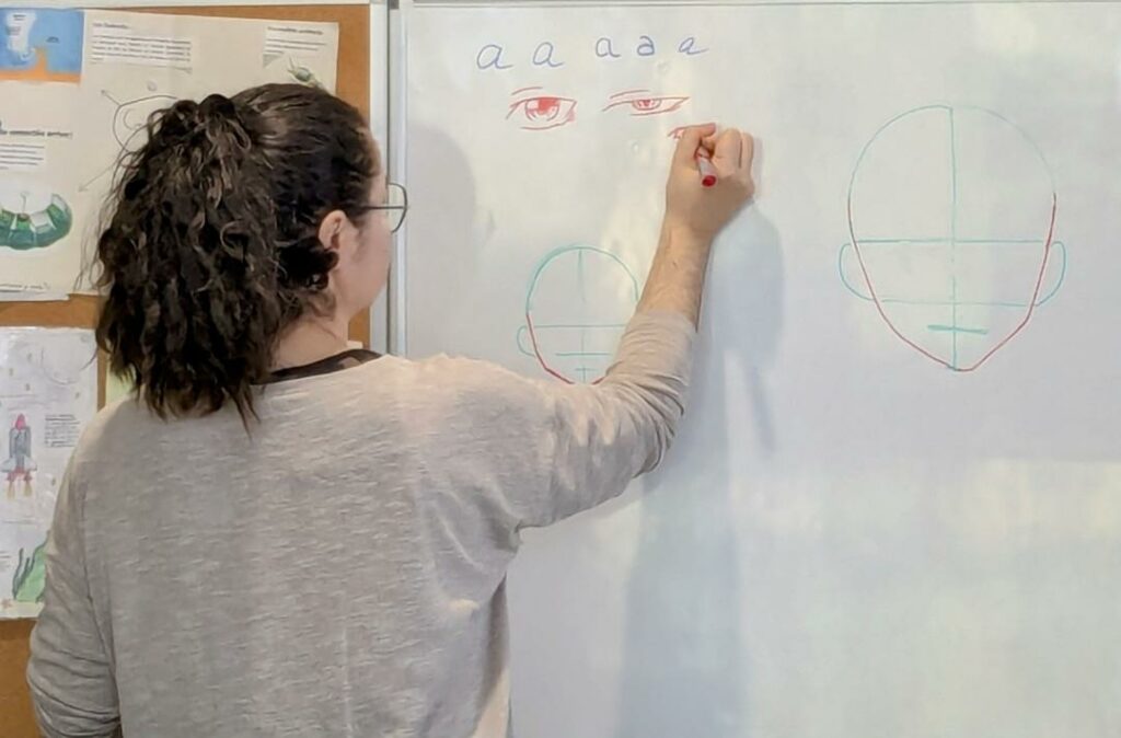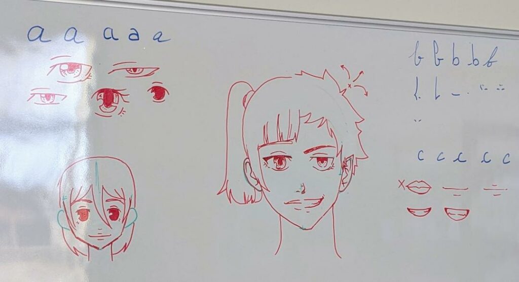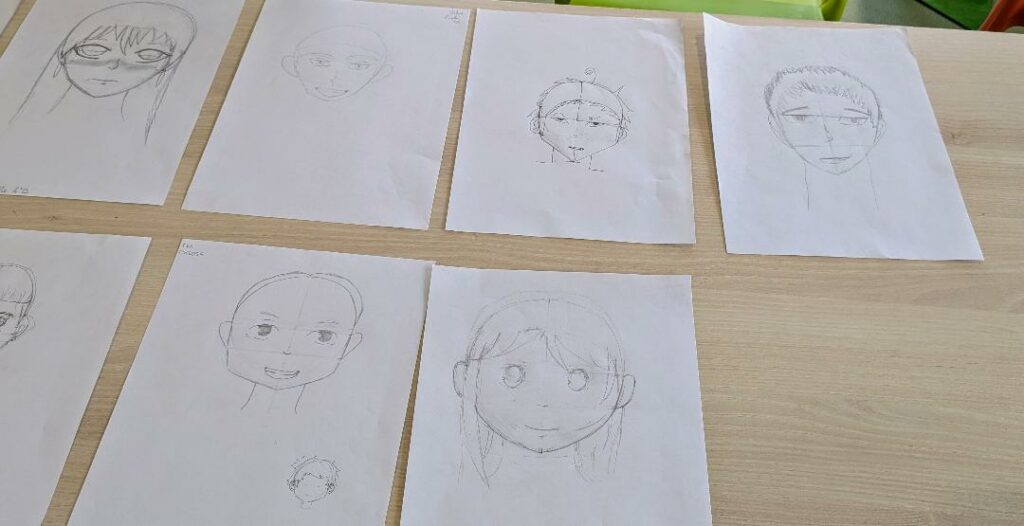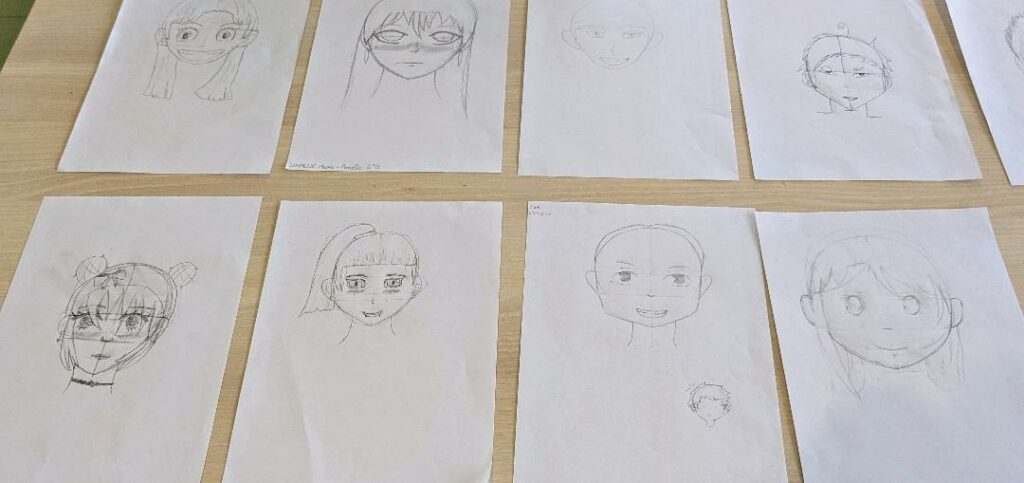 Une première intervention a permis de découvrir différentes techniques artistiques pour dessiner un portrait de personnage. Les résultats sont remarquables, compte tenu du temps imparti (moins d’une demi-heure).