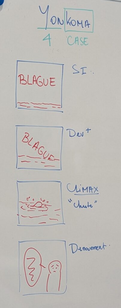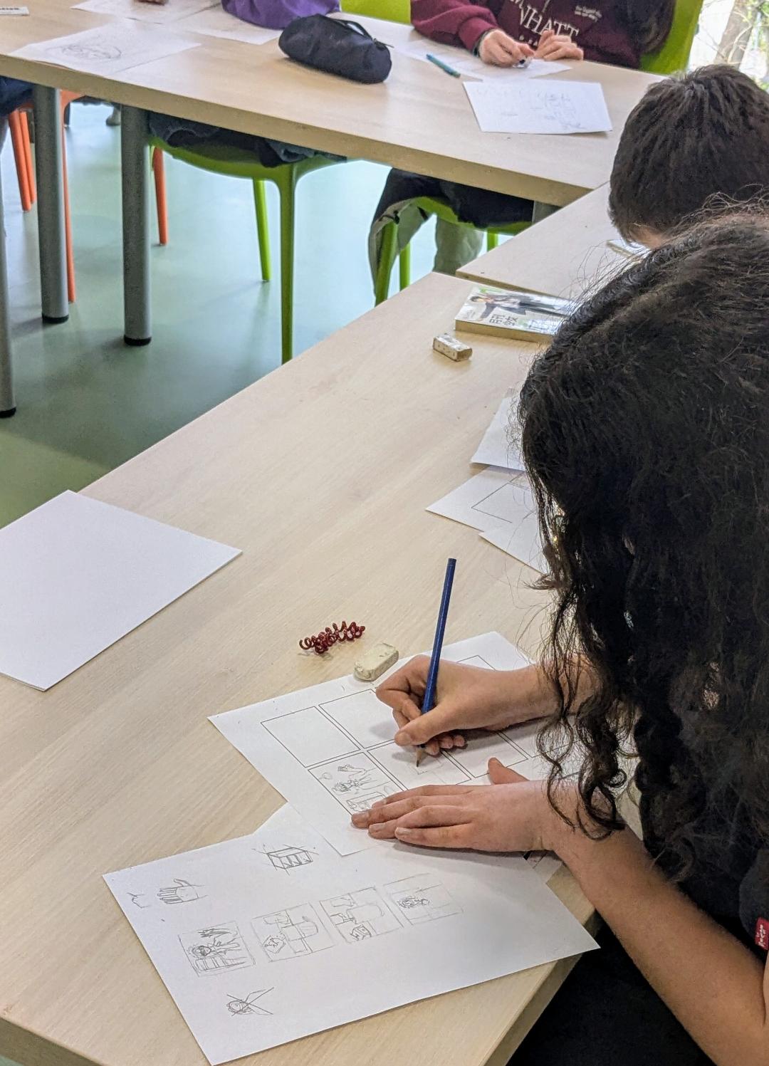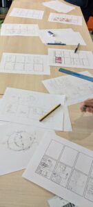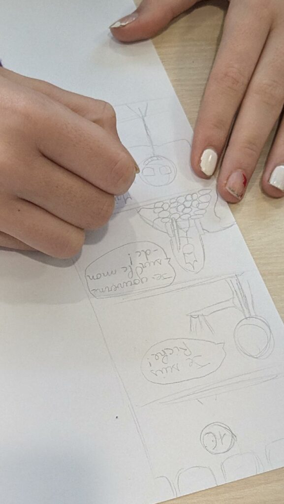 Une deuxième intervention a visé la création d’une histoire dans les vignettes en respectant un schéma narratif, sous les conseils pertinents de la formatrice. Les story boards ou brouillons utilisés n’ont pas démotivé pour autant les artistes en herbe.