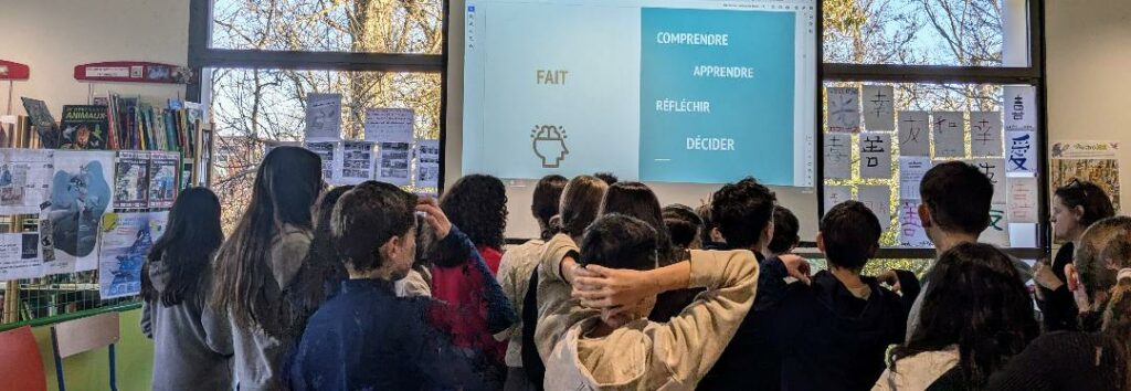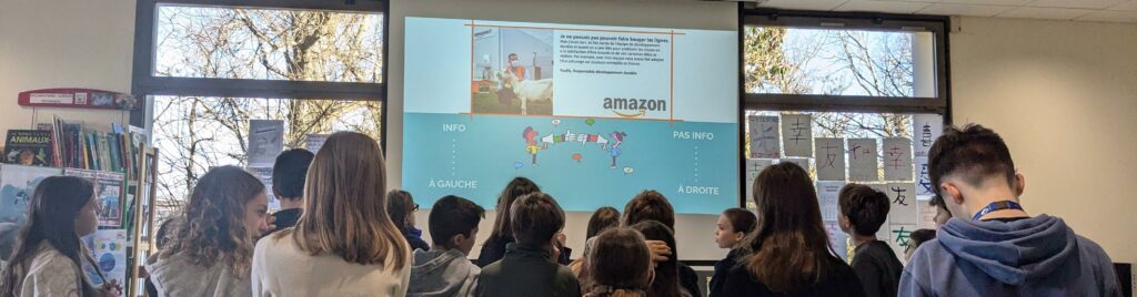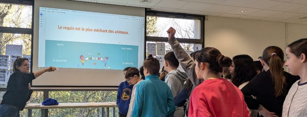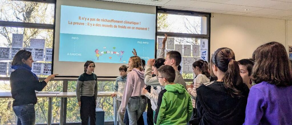 Se mettre en mouvement dans un espace et réfléchir ensemble, argumenter sa position sur des questions médiatiques liées à une planète en danger : tel a été le défi lancé aux élèves par la journaliste-pigiste pour « Mon Quotidien », « Géo Ado », « Wapiti » et depuis 2024 rédactrice dans le magazine « La Salamandre junior ». Revenir aux « sources » des informations relayées et insister sur la nécessité de vérifier les faits en développant son esprit critique et en se posant les bonnes questions (« Est-ce une information ou une opinion ? ») : tel a été le message phare de cet atelier de sensibilisation aux dangers des idées reçues, pour une meilleure connaissance du métier de journaliste et pour lutter contre les « fake news ».