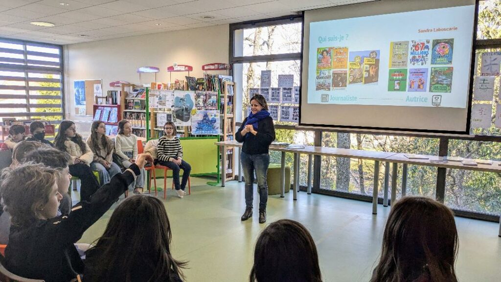 Dans le cadre du projet Océans, en lien avec le festival de Léguevin, les cours de SVT et d’EMI, les trois classes de 6e ont accueilli jeudi 6 février dernier la journaliste et autrice Sandra Laboucarie.
