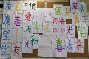 Dans le cadre de l’atelier culture japonaise, les élèves ont exposé leurs kanji témoignant de messages pacifiques et bienveillants en japonais et en français… Ces œuvres sont à voir dans le hall d’entrée du collège.