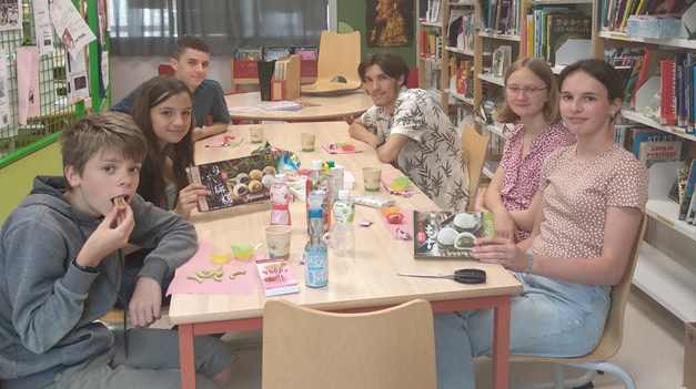 Pour clore l’année scolaire, des élèves de l’atelier culture japonaise ont pu découvrir quelques douceurs sucrées telles que les « Wagashi » ou « Mochi » (douceurs traditionnelles d’origine végétale comme le riz, la cacahuète, le sésame ou les haricots rouges), les « Choco banana » sous la forme de mikados ou de bonbons … Le tout était accompagné non pas de thé vert « Matcha » comme le veut la tradition japonaise, mais de boissons fraîches à base de litchi, pastèque, lait de coco ou de limonade… Un moment de partage gustatif bien apprécié…