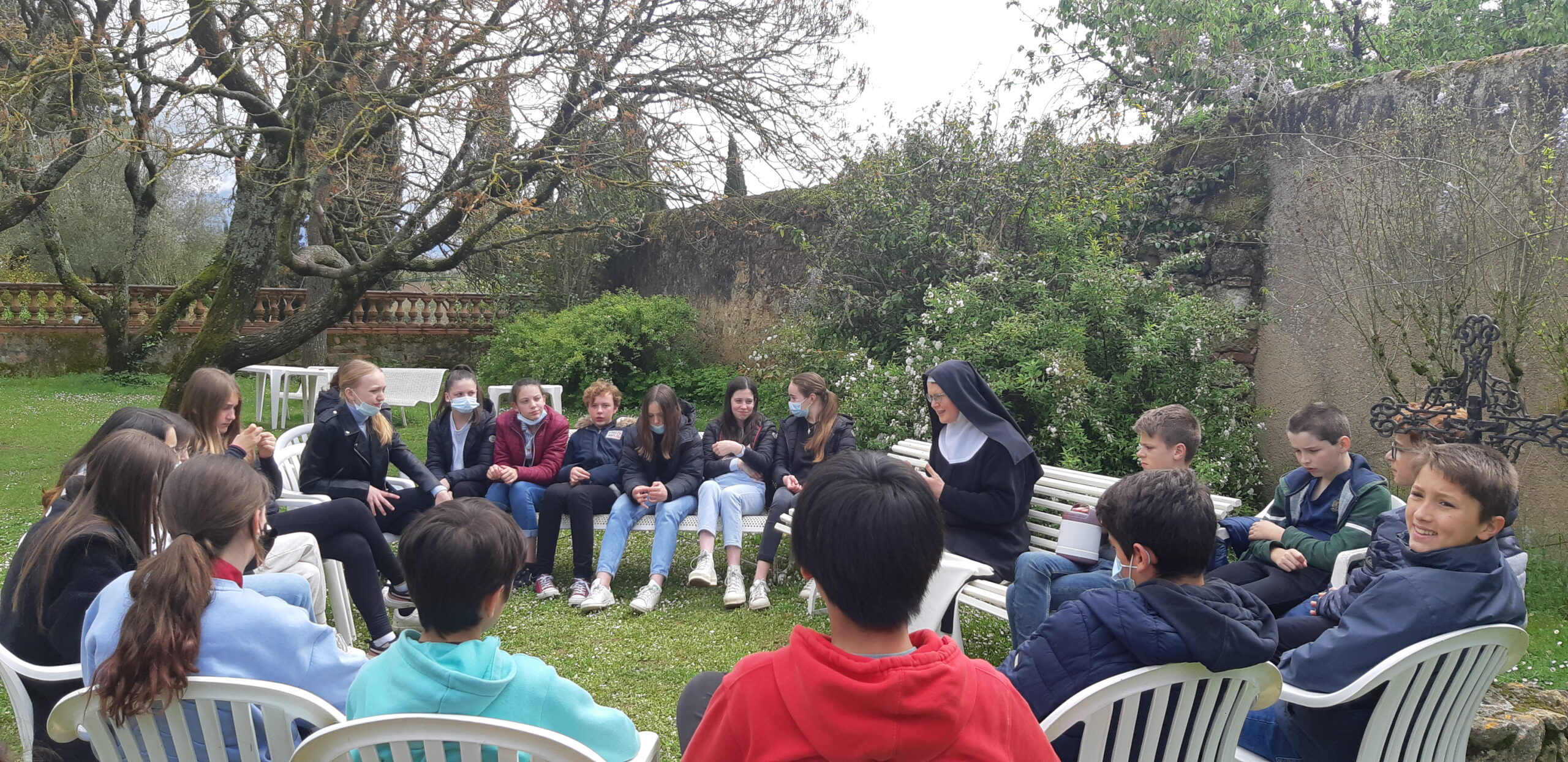 Puis à l’abbaye de Boulaur, après le pique-nique, les jeunes ont rencontré une sœur qui leur a expliqué leur vie au monastère rythmée par la prière et différents travaux. Après ce temps d’échange, une visite du monastère leur a été proposée.