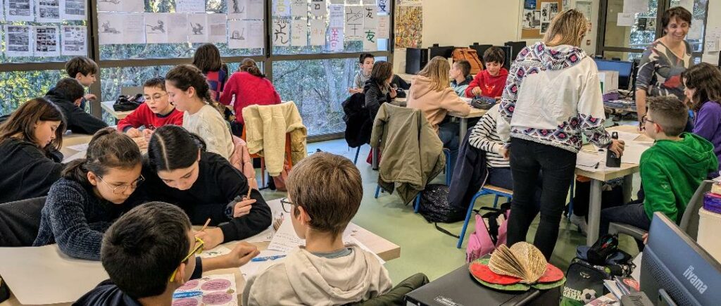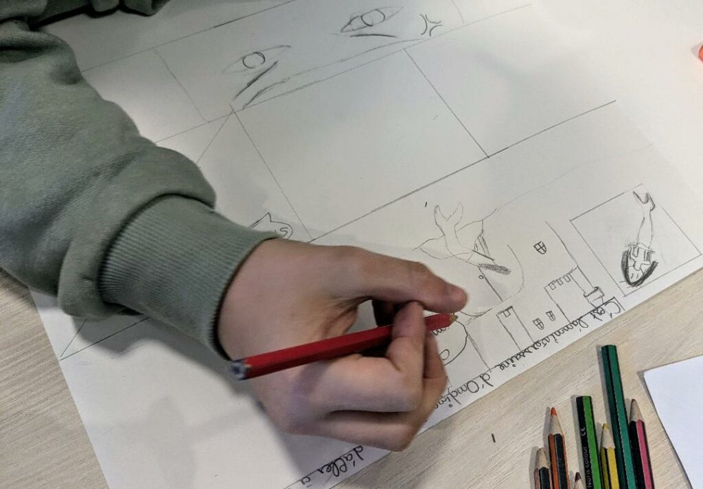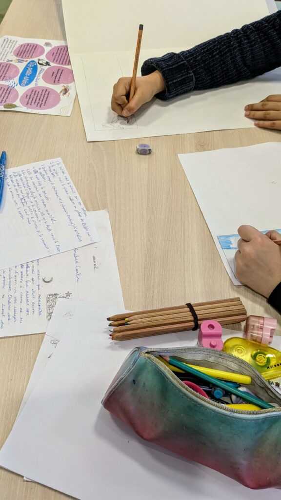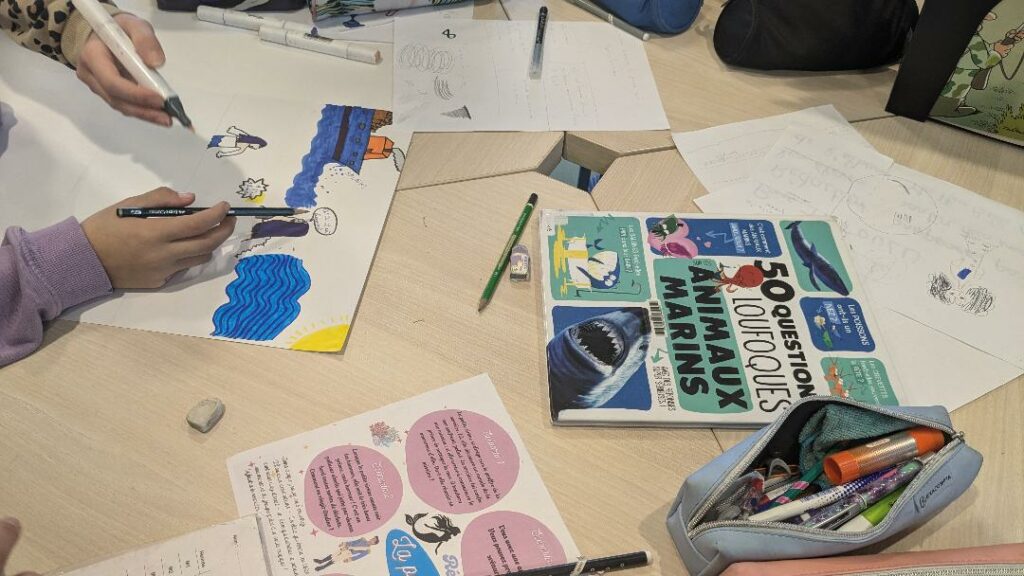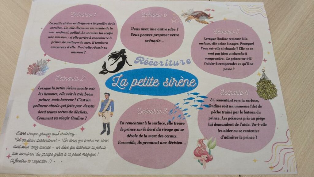 Après un temps d’échanges à propos du parcours artistique et du quotidien de la scénariste, les élèves répartis en 7 équipes de rédaction/illustration ont commencé à élaborer une suite écologique illustrée au conte « La petite Sirène ».