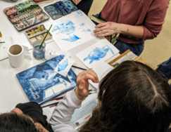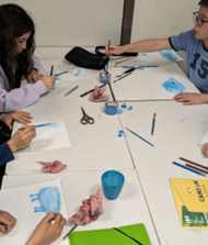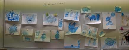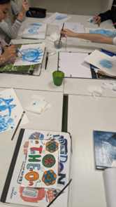 Après avoir assisté à une démonstration pratique, les élèves ont été ravis de mettre « la main à la pâte » en participant à un atelier graphique en salle d’Arts plastiques autour d’une ou plusieurs taches bleues sur feuille.